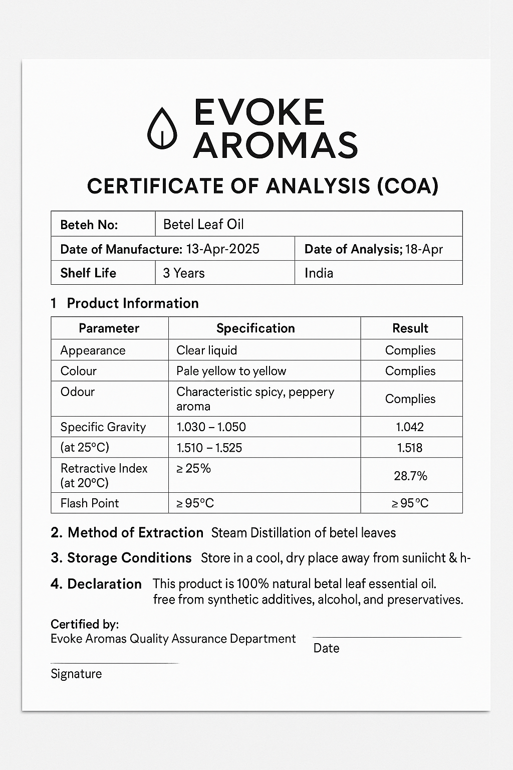 Evoke Aromas brings you 100% pure and natural Betel Oil, carefully extracted from the fresh leaves of the Piper betle plant using traditional steam distillation methods. Renowned for its aromatic, refreshing, and slightly spicy fragrance, Betel Oil is widely appreciated in aromatherapy, personal care, and traditional wellness practices.