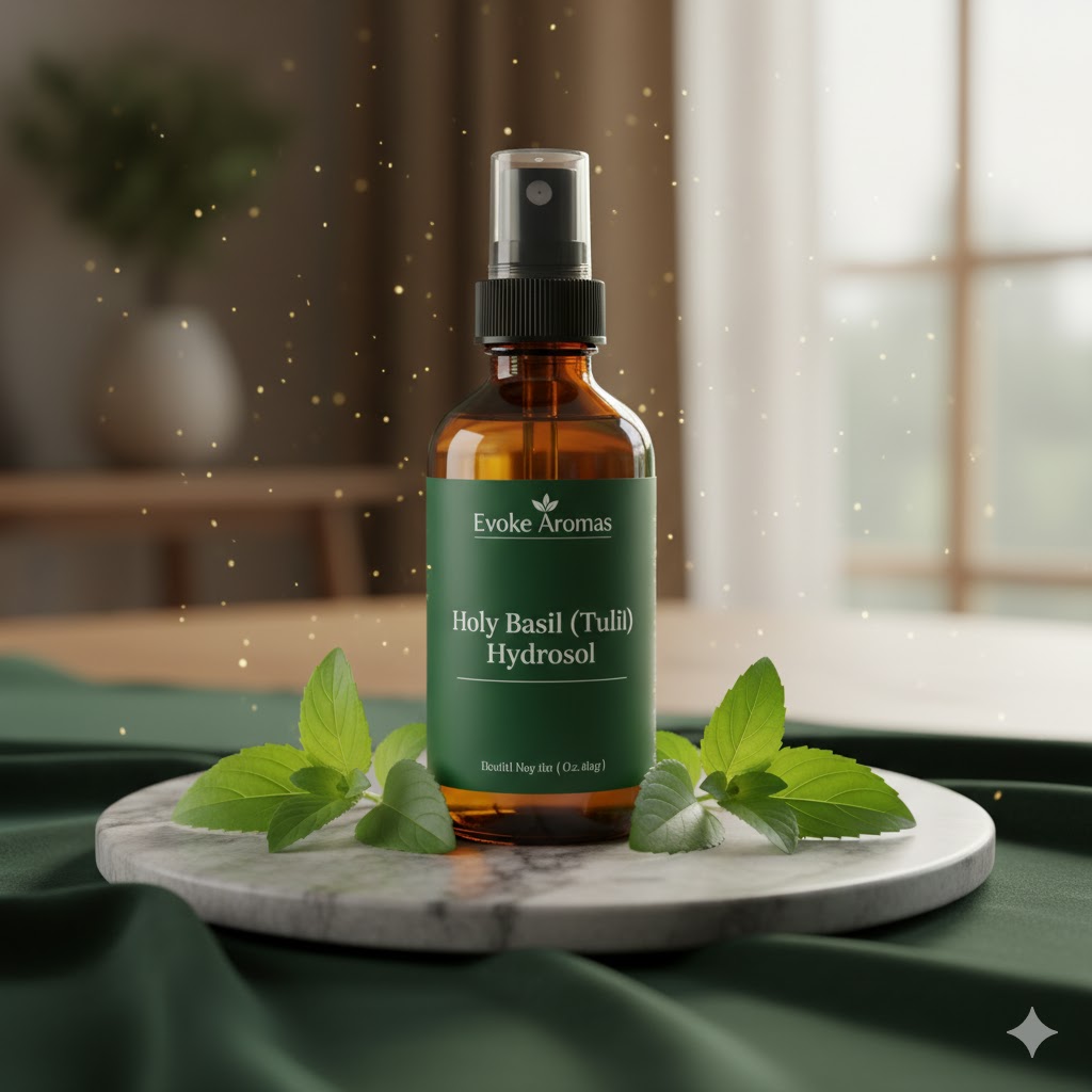 Evoke Aromas offers 100% pure and natural Holy Basil Hydrosol, obtained through steam distillation of fresh Tulsi leaves (Ocimum sanctum). Revered for centuries in traditional wellness practices, this hydrosol combines a refreshing, herbaceous aroma with powerful natural benefits for skin, hair, and overall well-being.