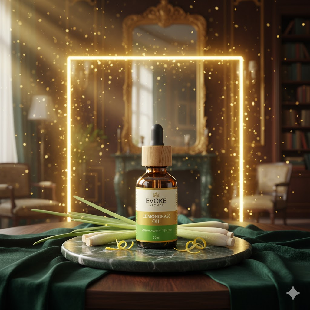 “Evoke Aromas’ 100% Pure Lemongrass Oil offers a fresh, citrusy aroma with natural antimicrobial, stress-relieving, and revitalizing benefits for wellness, skincare, and aromatherapy.”